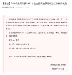 为深入学习贯彻习近平新时代中国特色社会主义思想,全面学习宣传党的十九届六中全会精神,落实立德树人根本任务,系统回顾全国高校思想政治工作会议召开以来高校思想政治工作的成效与经验,引导辅导员加强工作研究,总结工作经验,提炼工作成果,提升高校思想政治工作质量。best365积极参加由教育部思想政治工作司指导、《高校辅导员》编辑部开展的2021年度全国高校思想政治工作优秀案例征集活动。活动中,best365汽车工程学院辅导员孟洁老师申报的《润物无声,静待花开,用爱引领成长——记一名学业预警学生的“变形记”》案例荣获活动二等奖。