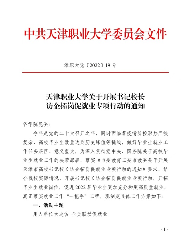 为深入贯彻落实教育部办公厅《关于开展全国高校书记校长访企拓岗促就业专项行动的通知》和市委教育工委、市教委《关于开展天津市高校书记校长访企拓岗就业专项行动的通知》部署要求,best365英国在线体育官网结合“迎盛会、铸忠诚、强当担、创业绩”主题学习宣传教育实践活动内容,访企拓岗促就业专项活动全面铺开。