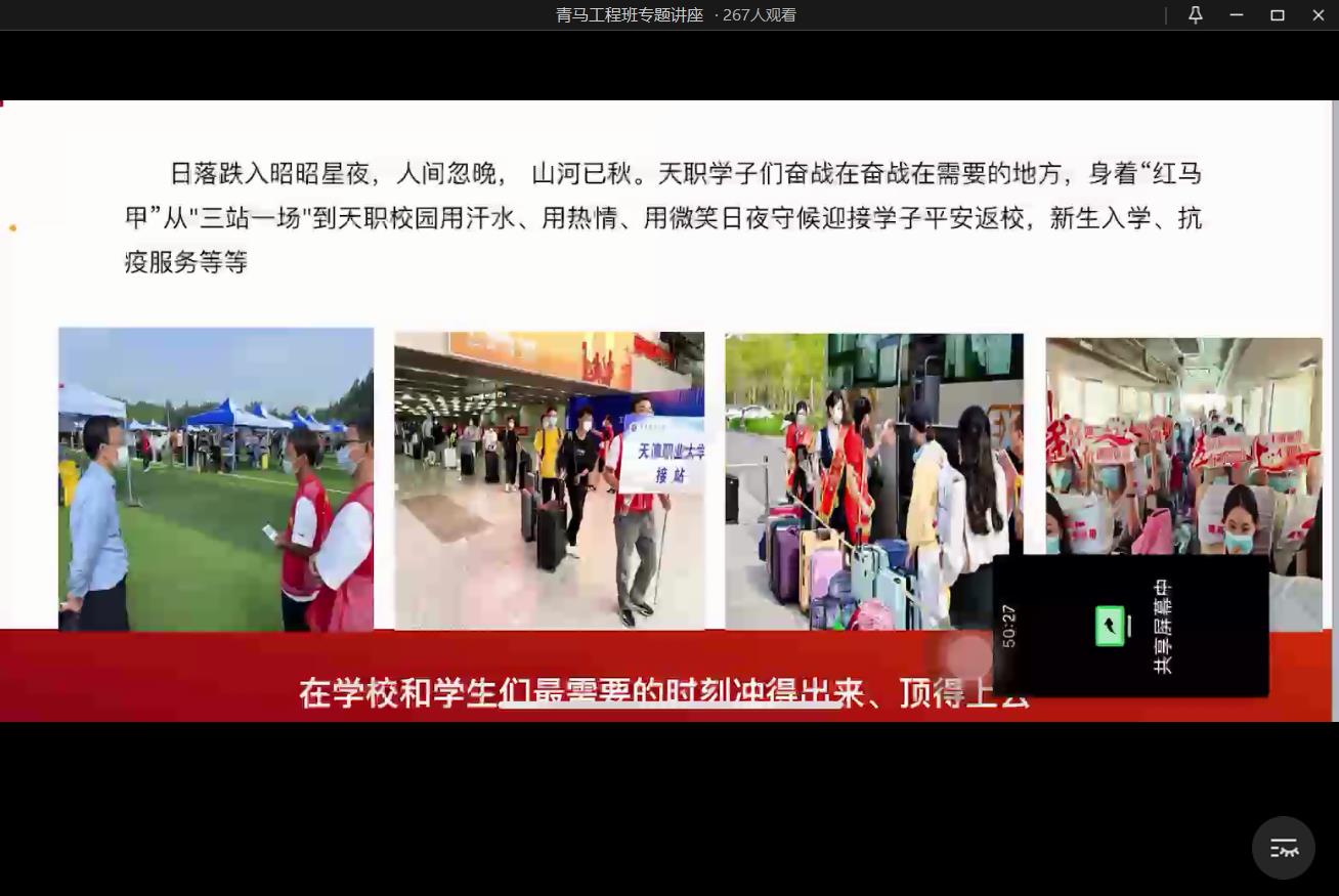 讲座中,贾老师展示了天职学子身着“红马甲”从"三站一场"到天职校园用汗水、用热情、用微笑日夜守候迎接学子平安返校,新生入学、抗疫服务等珍贵照片,彰显了新时代青年的责任与担当。她用朴实而生动的语言诠释了党对青年的关心、关怀,以及对新时代青年的殷切期盼。