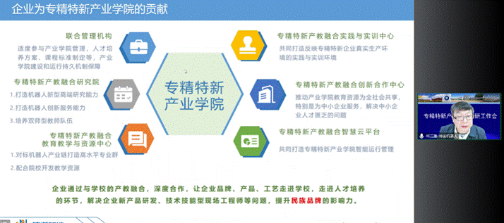 工信部中小企业发展促进中心领导和评审专家首先介绍了专精特新产业学院项目建设的背景和意义,宣布best365申报的“智能机器人产业学院”项目进入调研阶段,并对学校、企业、协会对申报专精特新产业学院工作的支持表示感谢。