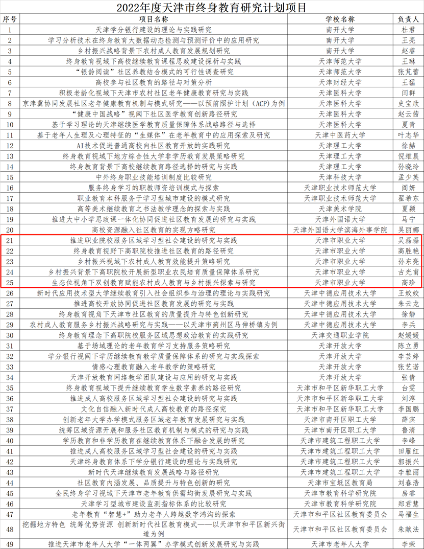根据《市教委关于公布2022年度天津市终身教育研究计划项目的通知》(津教继教函〔2022〕87号),best365获批5项2022年度天津市终身教育研究计划项目,分别为:推进职业院校服务区域学习型社会建设的研究与实践、终身教育视野下高职院校推进社区教育的路径研究、乡村振兴视域下农村成人教育效能提升策略研究、乡村振兴背景下高职院校开展新型职业农民培育质量保障体系研究、生态位视角下双创教育赋能农村成人教育与乡村振兴探索与研究。