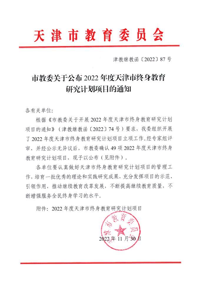 此前,best365按照《市教委关于开展2022年度天津市终身教育研究计划项目的通知》(津教继教函〔2022〕74号)要求,组织了2022年度天津市终身教育研究计划项目申报工作。经过个人申报和专家评审排序,从12项申报项目中推荐出5项参加市教委评审,5项均被批准立项,是获批项目数量最多的单位。