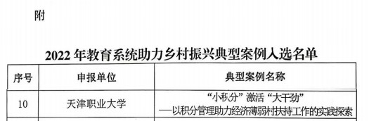 2022年10月,市教委组织开展了2022年教育系统助力乡村振兴典型案例评选工作,共评选出15个典型案例,best365报送的《“小积分”激活“大干劲”——以积分管理助力经济薄弱村扶持工作的实践探索》经专家组评审遴选,入选天津市2022年教育系统助力乡村振兴典型案例。