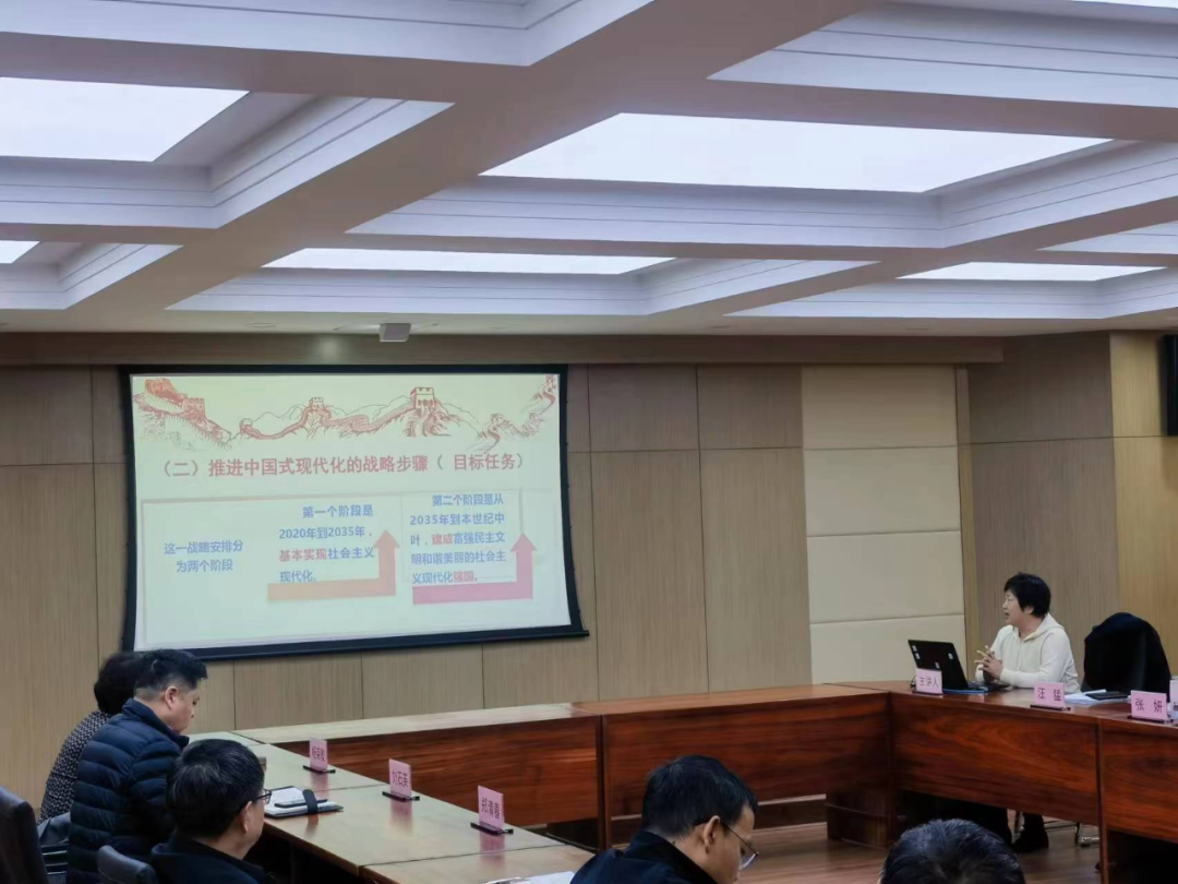 会议首先由马克思主义学院李万锦教授以《正确理解和大力推进中国式现代化》为主题进行了领学,主要从中国式现代化是怎么来的、什么是中国式现代化、如何大力推进中国式现代化三个方面进行了解释和阐述。随后,会议集中学习了《习近平在学习贯彻党的二十大精神研讨班开班式上发表重要讲话强调正确理解和大力推进中国式现代化》《习近平在中共中央政治局第三次集体学习时强调 切实加强基础研究 夯实科技自立自强根基》《习近平:全面从严治党探索出依靠党的自我革命跳出历史周期率的成功路径》等篇目。