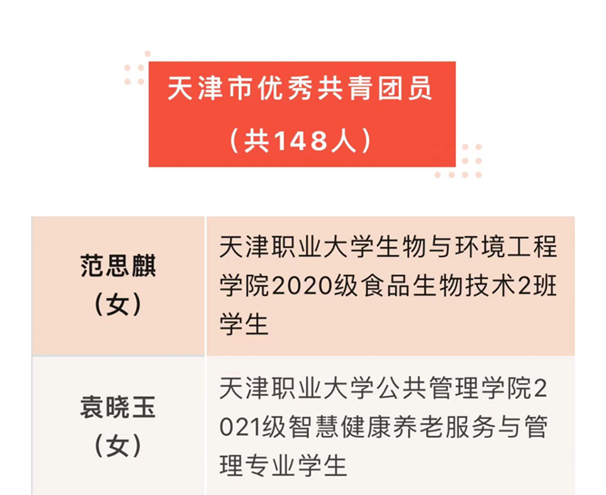 范思麒,女,汉族,中共预备党员,2020级食品生物技术2班团支部副书记、班长,荣获第十三届“挑战杯”中国大学生创业计划竞赛国家级金奖、第八届中国国际 “互联网+”大学生创新创业国家级金奖、第九届“创青春”中国青年创新创业大赛(乡村振兴专项)国家级铜奖、第七届中国国际“互联网+”大学生创新创业国家级铜奖、“中银杯”第八届天津青年创新创业大赛暨创青春中国青年创新创业大赛天津市金奖等奖项,以及天津市大学生年度人物、天津市优秀学生等荣誉称号。