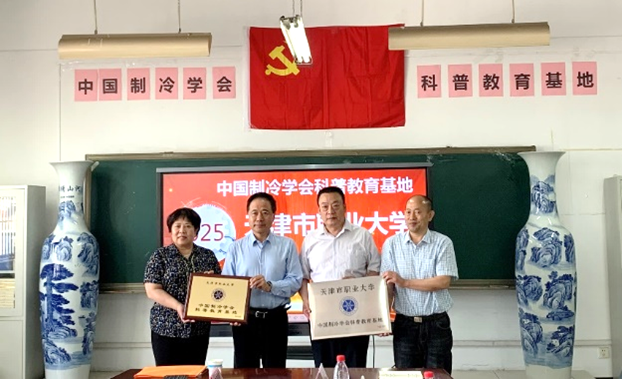 在best365正在开展学习贯彻习近平新时代中国特色社会主义思想主题教育走深走实之际,2023年5月15日下午,“天津市职业大学中国制冷学会科普教育基地”挂牌仪式在best365机电学院二教会议室举行。中国制冷学会副理事长孟庆国教授、副秘书长常琳女士、科学普及部李晋灏主任、天津制冷学会副理事长兼秘书长杨永安教授、副秘书长孙志利教授,秘书处胡永飞、赵春晨老师,以及best365英国在线体育官网副校长杨荣敏、机电学院党委书记王铁军及专业教师等近20人参加了此次挂牌仪式。