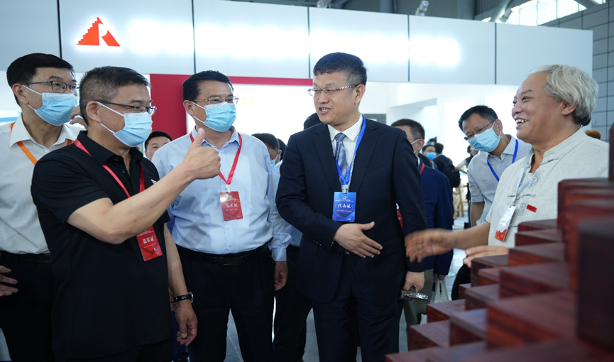 活动开始前,教育部职成司副司长林宇等与会领导来到“天职”展台参观,非遗技艺传承人辛全生团队正在现场组装世界上最大的鲁班锁——“大菠萝”,郑清春校长邀请林宇副司长一起为其安装上最后一根榫卯木条,现场爆发出热烈的掌声。郑清春校长介绍说,将鲁班锁与榫卯技艺引入学校课堂,这是对国家非遗技艺与文化最好的保护和传承,是对工匠精神的尊崇和发扬,最终是要引导学生养成严谨专注、敬业专业、精益求精和追求卓越的精神品质。他还引导大家参观了综合验光仪学习流程与考核虚拟仿真系统、静电纺丝机等展品。