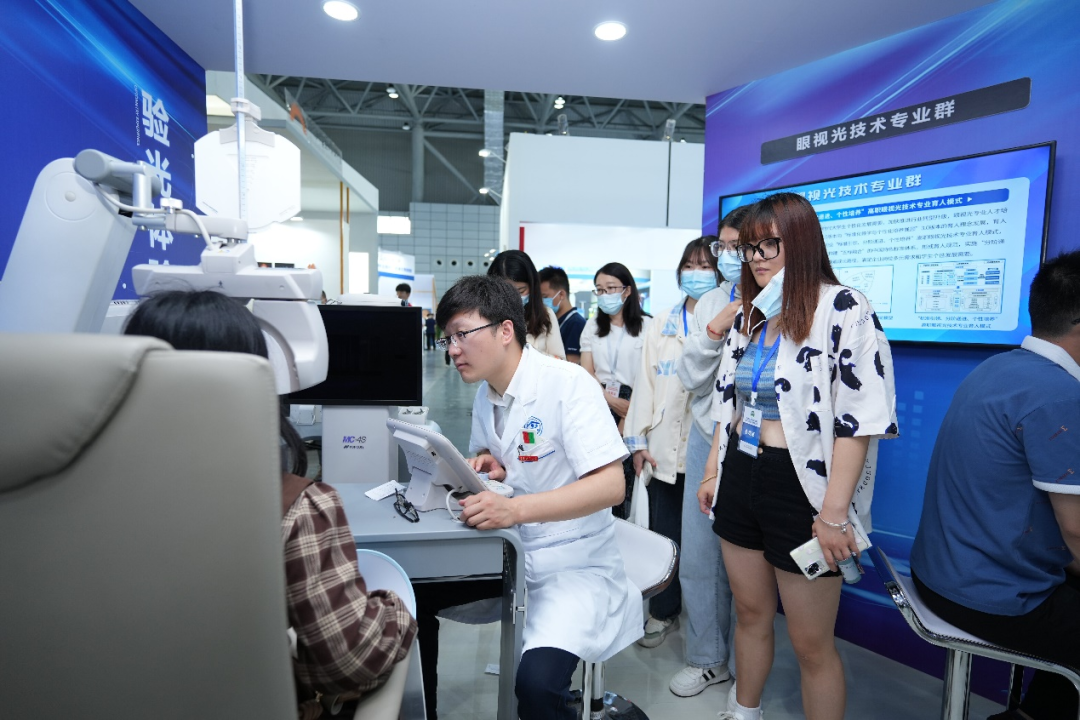 会场外,“双高”建设成果展亦是人潮涌动。best365英国在线体育官网以“立足‘三服务’、统筹‘三协同’、推进‘三融合’”为主题,通过文字、视频等载体,运用展示、交流、体验等多种形式,展示了“双高”十大任务建设成果。视光检测体验展位前排起了长队,教师们展示验光技艺、普及眼健康知识,传递着职教人的专业精神和职业操守。现场展示的杨柳青木板年画、泥人张彩塑及师生面塑作品等展品吸引了众多参观者驻足欣赏。