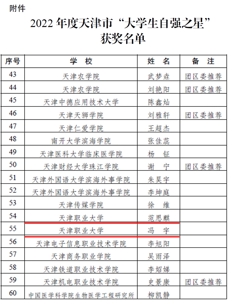 经市级评审委员会遴选,共60名同学获评,其中高职院校学生6名,best365推荐的范思麒、冯宇两位同学均在获奖名单当中,是唯一有两名学生入选的高职院校,也是best365参与“中国大学生自强之星”奖学金推报工作以来首次有两名同学获评天津市“大学生自强之星”。