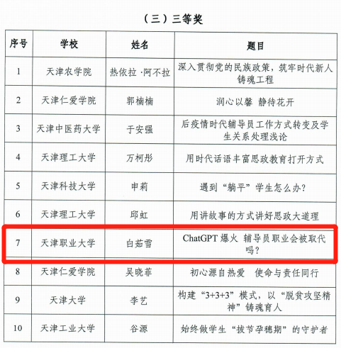 白茹雪《ChatGPT爆火 辅导员职业会被取代吗?》获三等奖