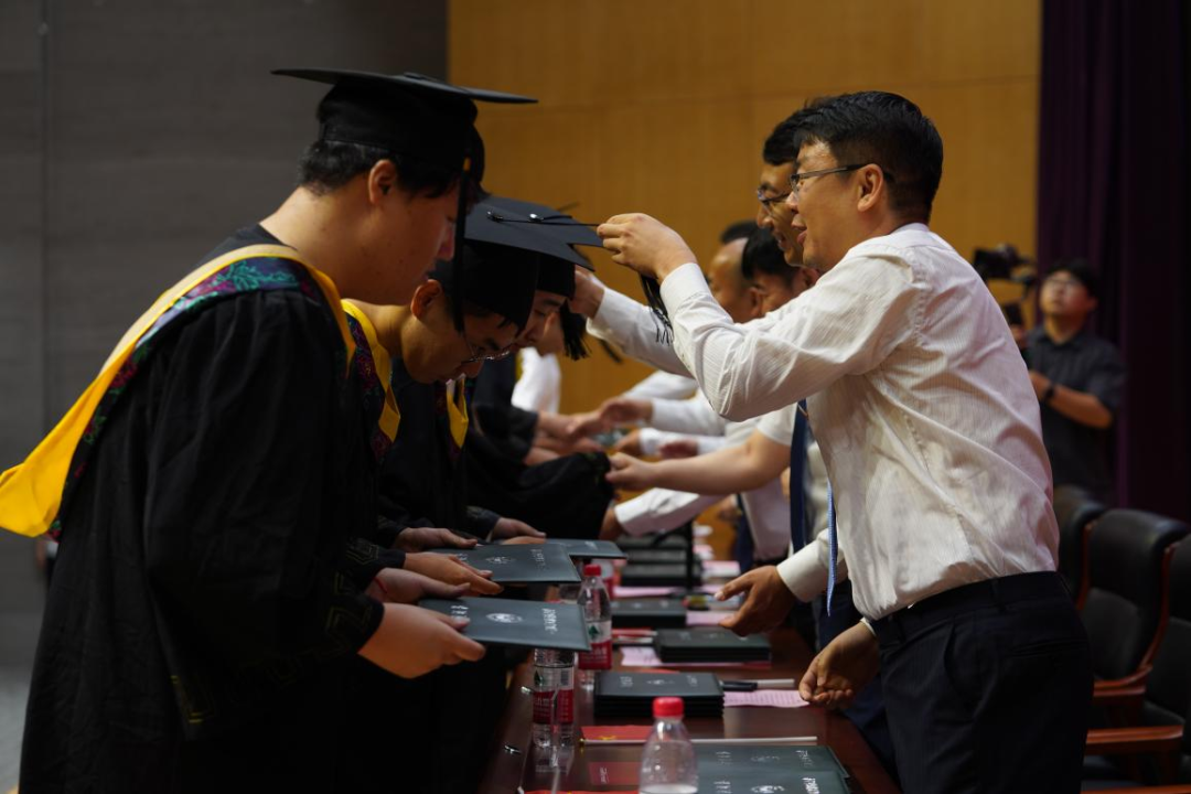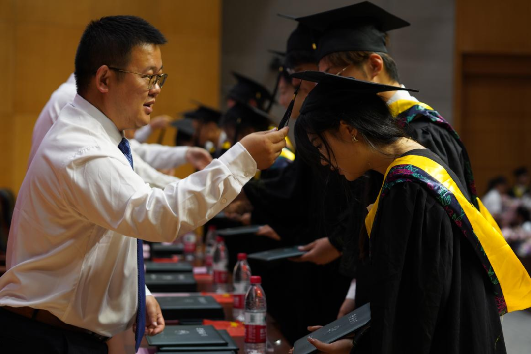 主席台领导为毕业生拨穗并授予学位。