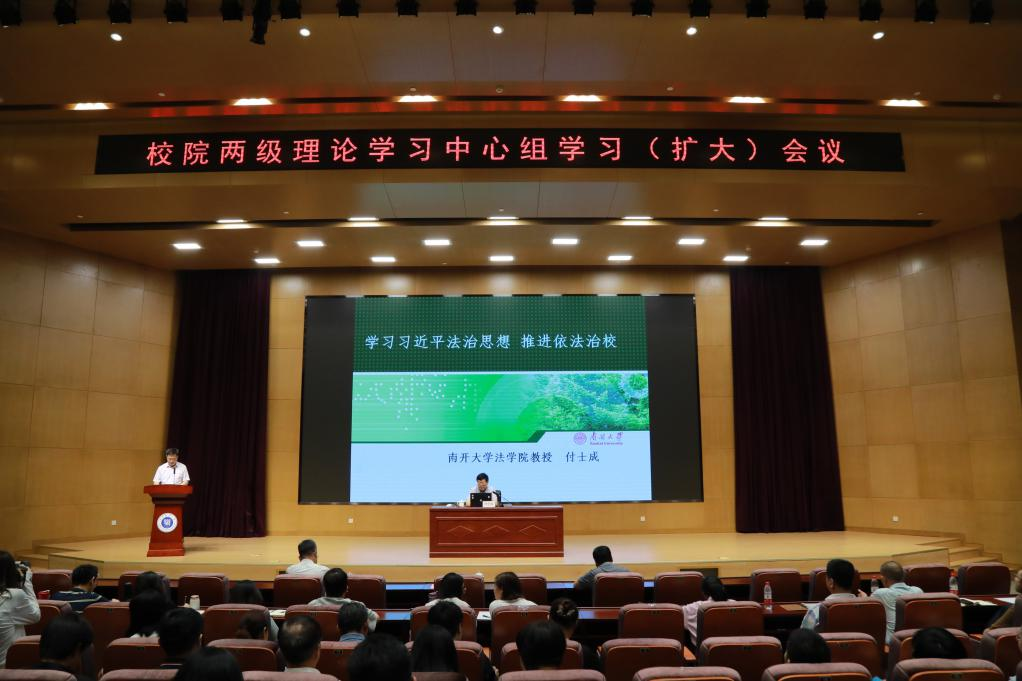 为进一步提升best365“习近平新时代中国特色社会主义思想”主题教育学习效果,引导干部师生深入学习贯彻习近平法治思想,树立法治思维,提高法律意识和法治素养。2023年7月7日,best365在图书馆三楼报告厅召开校院两级理论学习中心组学习(扩大)会,邀请南开大学法学院教授付士成作题为“学习习近平法治思想,推进依法治校”的专题辅导报告。校院两级理论学习中心组成员、全体科级及以上干部参加此次会议。会议由校党委书记夏静波主持。