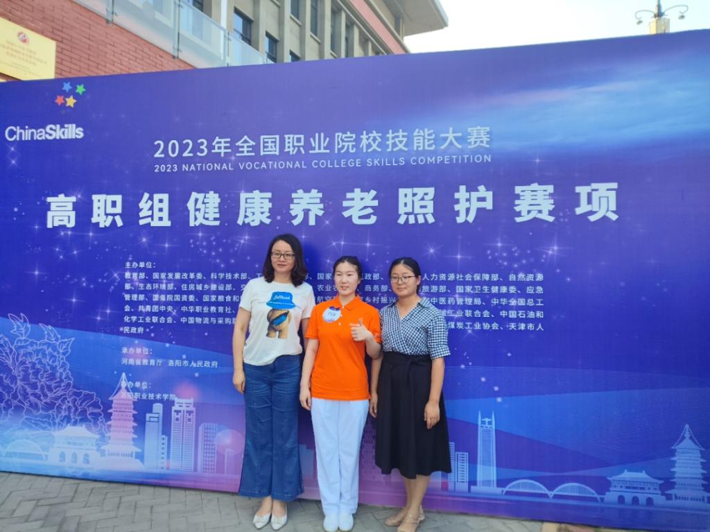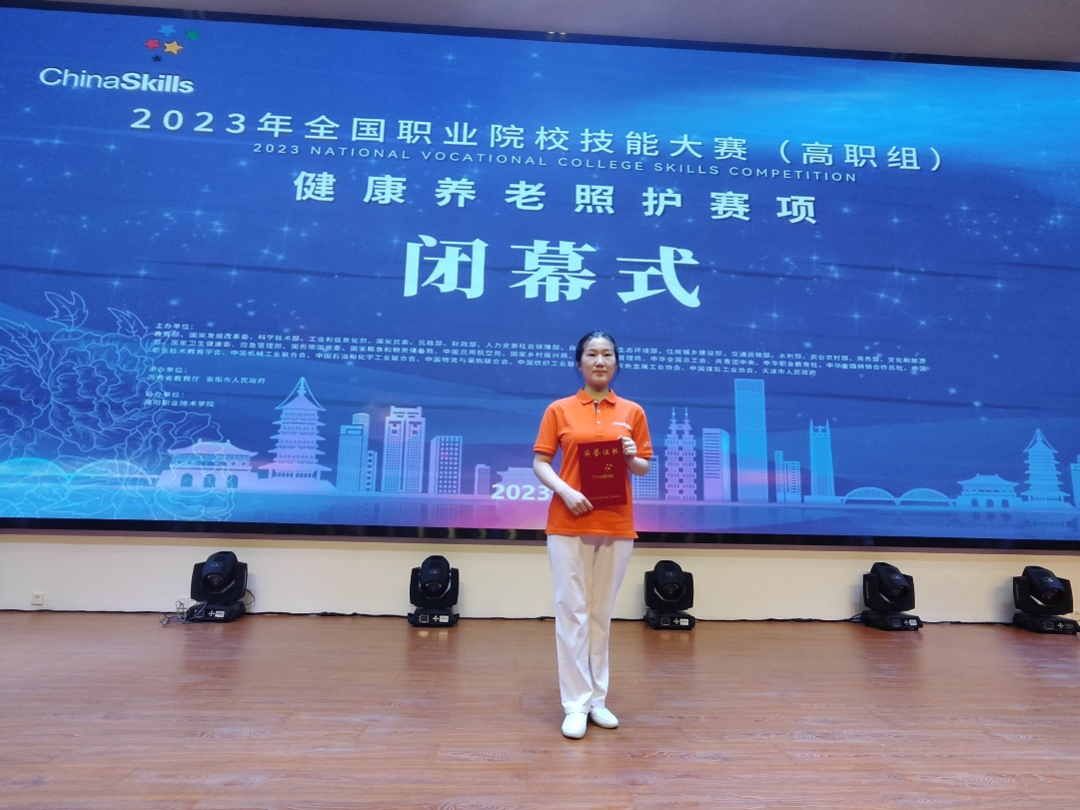 best365公共管理学院21级智慧健康养老服务与管理专业学生晋思遥在刚刚结束的2023年全国职业院校技能大赛健康养老照护赛项中,努力拼搏、稳中求进,获得三等奖。这是近几年来天津高职院校在该赛项上首次突破国赛最好成绩。今年,健康养老照护赛项于7月21日-7月22日在河南洛阳职业学院举行,也是全国职业院校技能大赛首次调整后并融入新赛规的赛项,来自全国31个省(直辖市、自治区)的61个院校、61支代表队参加了本次比赛。公管学院副院长和专业指导教师陪同参赛,并观摩了全程比赛场景,向兄弟学校学习了宝贵的备赛经验。