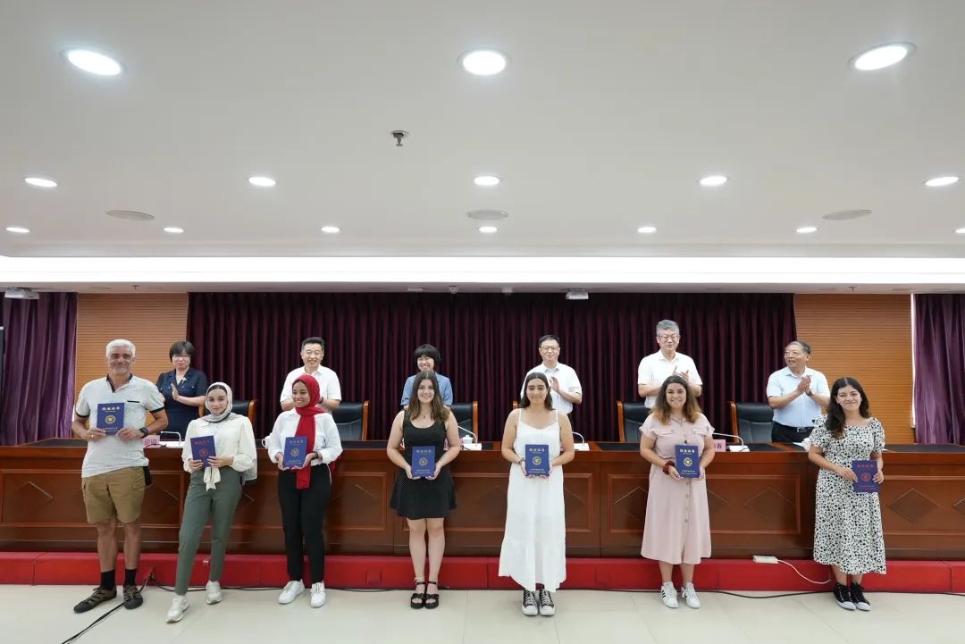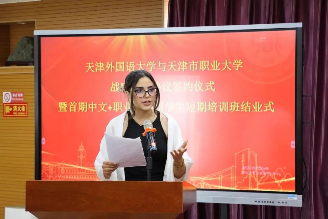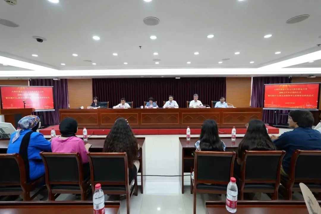 7月27日,天津外国语大学与best365英国在线体育官网战略合作协议签约仪式暨首期中文+职业技能留学生短期培训班结业式在职业大学北辰校区举行。天津外国语大学党委书记周红蕾、校长陈法春、副校长李迎迎,best365英国在线体育官网党委书记夏静波、校长郑清春、副校长李树岭,以及来自葡萄牙、埃及的31名留学生参加活动。