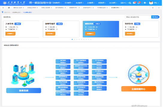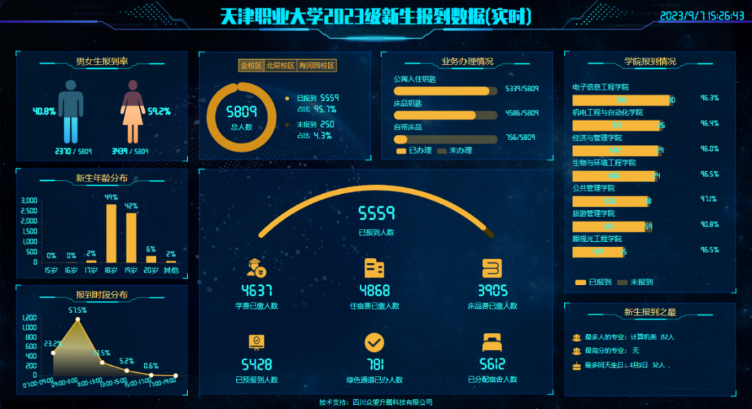 通过大数据中心平台对新生基础数据进行质量检测,保证新生数据源头统一、完整,协同学工部、教务处、财务处等部门,向迎新、学工、财务、网络认证、一站式服务大厅、智慧教室等系统提供学生状态数据,实时更新,确保新生注册报到、学宿费缴纳顺利进行,在数据大屏中实时展示新生报到数据,实现“数字化迎新”管理。入学报到前,为新生统一开设校园网、校园vpn、智慧天职APP账号,同时优化学生智慧天职APP功能,助力新生尽快熟悉和掌握学校提供的各类信息化服务。