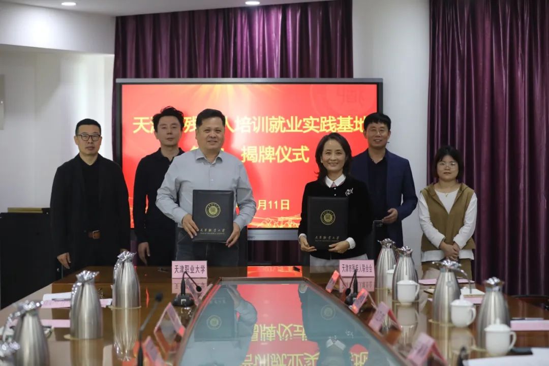 党委常委、副校长刘石英及合作教育办公室、继续教育中心共同出席签约、揭牌仪式,并共同见证第一批天津市残疾人培训就业实践基地签约、揭牌。同批共同揭牌的还有天津理工大学和天津交通职业技术学院,出席仪式有天津理工大学党委委员、副校长叶宁、聋人工学院院长王春东;天津交通职业技术学院副院长姚卫萍、继续教育部部长马超。