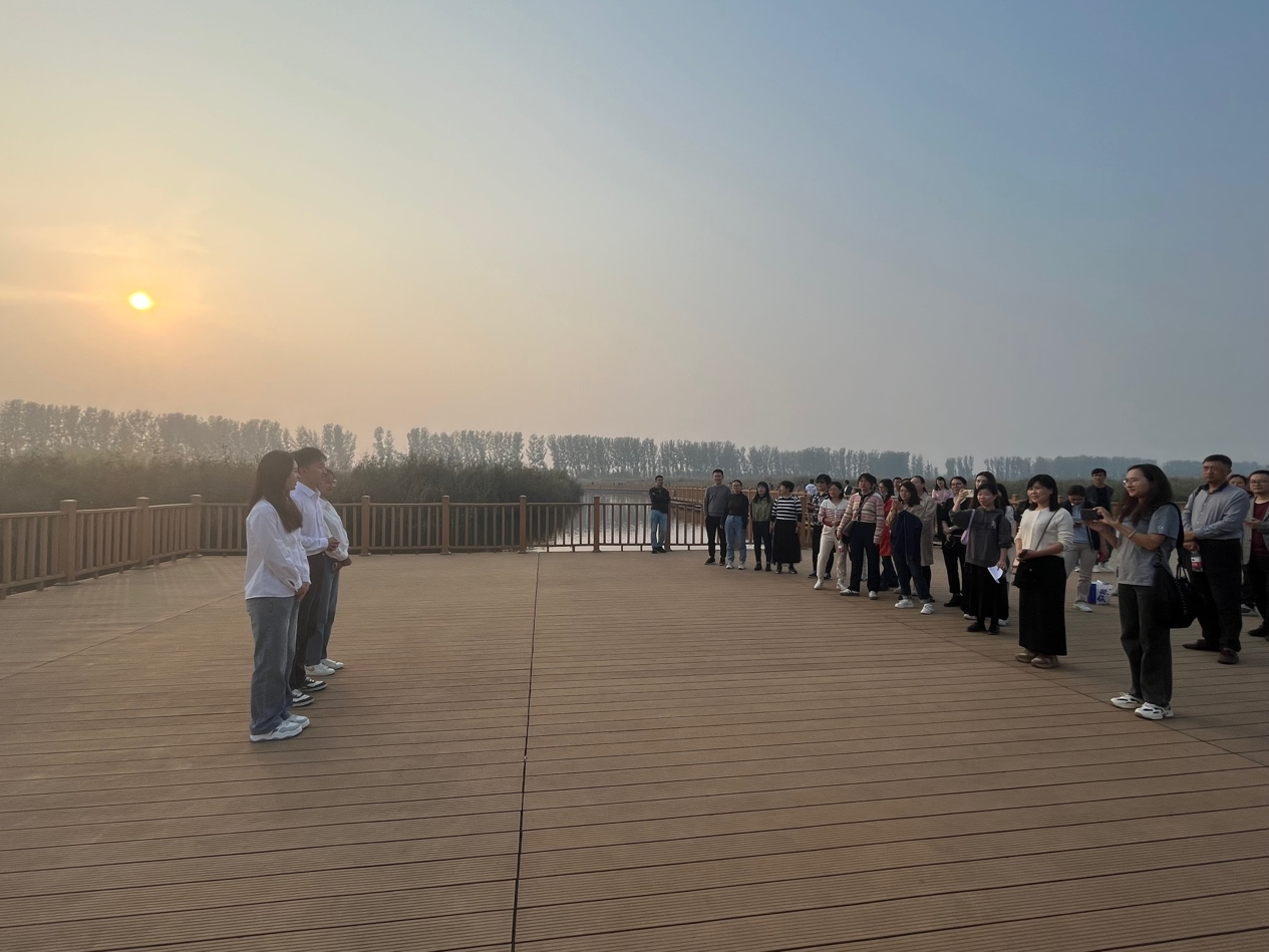 下午,师生们前往雄安新区启动区中国电信智慧城市产业园进行调研学习。在途经雄安新区“三校一院”时,师生们为新区绿色宜居及便利的教育和医疗配套设施所震撼。到达中国电信智慧城市产业园后,工作人员向师生们介绍了在新发展理念引领下的园区建设,这里肩负着建设雄安数字城市的责任使命。数字道路、智慧园区、智慧城市这些现代化、数字化的理念与设备让师生们更深刻地理解了这座“未来之城”的地上、地下、云上“三城模式”对中国发展的引领意义。最后一站,师生们来到雄安新区重要的生态支撑地白洋淀,学生代表以“生态文明建设”为主题现场为我们讲述了一堂行走的思政课。白洋淀生态环境治理是雄安新区建设发展的重要方面,近年来,白洋淀经历了有史以来最大规模的系统性生态治理,清澈的湖水、捕鱼的野鸭、南飞的鸿雁……一幅幅生态美景使师生们舒缓工作和学习压力的同时也感受到了我国生态文明建设的重大成就。