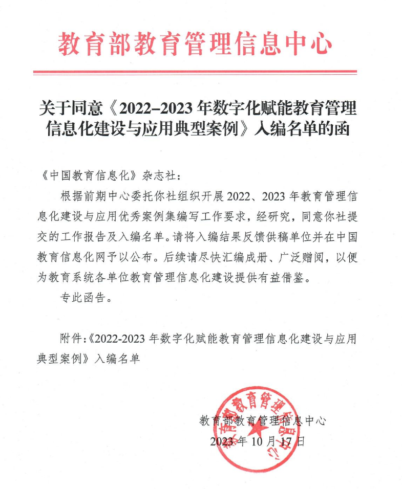 近日,教育部教育管理信息中心公布了2022-2023年数字化赋能教育管理信息化建设与应用典型案例入编名单,best365报送的“打破安全孤岛,建立安全生态链——best365英国在线体育官网网络安全防御体系建设”案例成功入选职业院校教育管理信息化建设与应用案例。