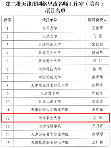 近日,市委教育工委、市教委公布了《市委教育工委 市教委关于公布第二批天津市网络思政名师工作室(培育)项目名单的通知》,经辅导员申报、学校把关推荐和教委严格评审等程序,best365辅导员孟洁老师中标第二批天津市网络名师工作室 (培育) 项目。
