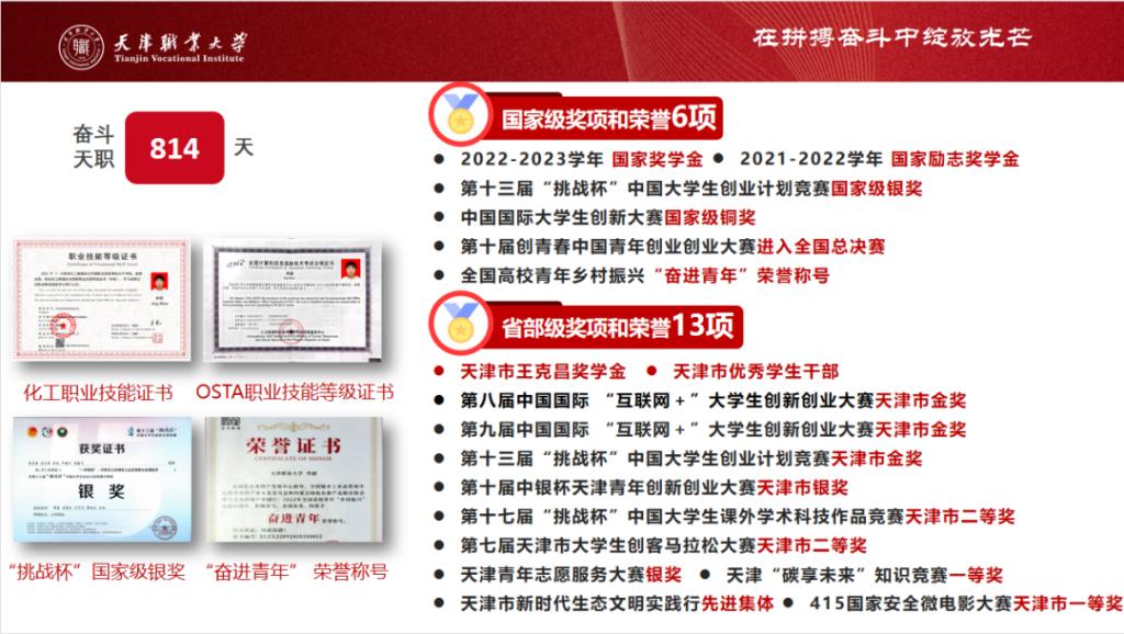 从与天津的相遇开始,井硕用脚步丈量天津。从少年中国说到觉悟先行,从大沽炮台到平津战役纪念馆,天津的百年红色文化滋养他坚定信仰。作为理论宣讲团成员,井硕50余次走进课堂为3500余学生宣讲天津的历史故事,了解天津,爱上天津。井硕深知学有所成,方能大有可为,他专业成绩排名第一。考取2项化工职业技能证书,获得国家奖学金等6项国家级奖项和荣誉,13项省部级奖项和荣誉。以己之所学,赴津之所需。