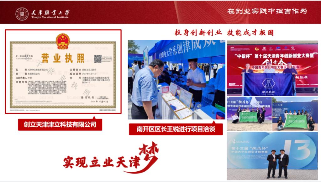 在天开园,南开区王锐区长说:“一个高职生,短短两年在科创上取得这样的成果真是了不起,一定要尽快投产”。井硕创办津立科技有限公司,实现立业天津的梦想。目前已与飞宇集团等三家企业达成战略合作,成功设计年处理3万吨的生产线,三类基础油纯度达99%以上,运行成本降低 40%,实现科技引领遥遥领先。团队受到津云等多家媒体的采访,到全国职教活动周、青年创业主题展进行推广洽谈,收到天开园等三个区的入驻邀请。
