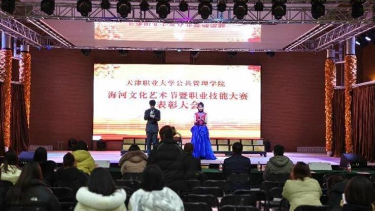 为深入学习贯彻落实党的二十大精神,推进文化自信自强,发展和弘扬中国特色社会主义先进文化,丰富学生的课余生活,展示大学生积极向上的精神风貌,公共管理学院于12月20日15时在海河园校区多功能厅成功举办首届“海河”文化艺术节暨职业技能大赛表彰大会。
