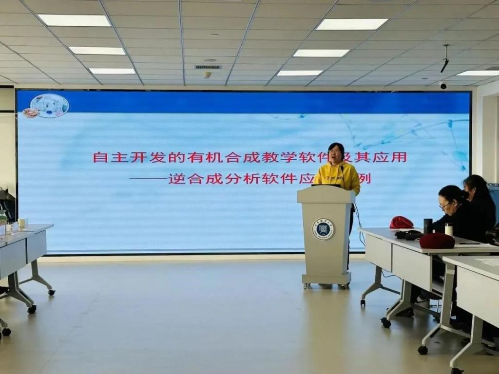 全国职业院校教学能力比赛二等奖获得者、药品生产技术专业王欣以“自主开发的有机合成教学软件及应用-逆合成分析软件应用案例”为题目分享。