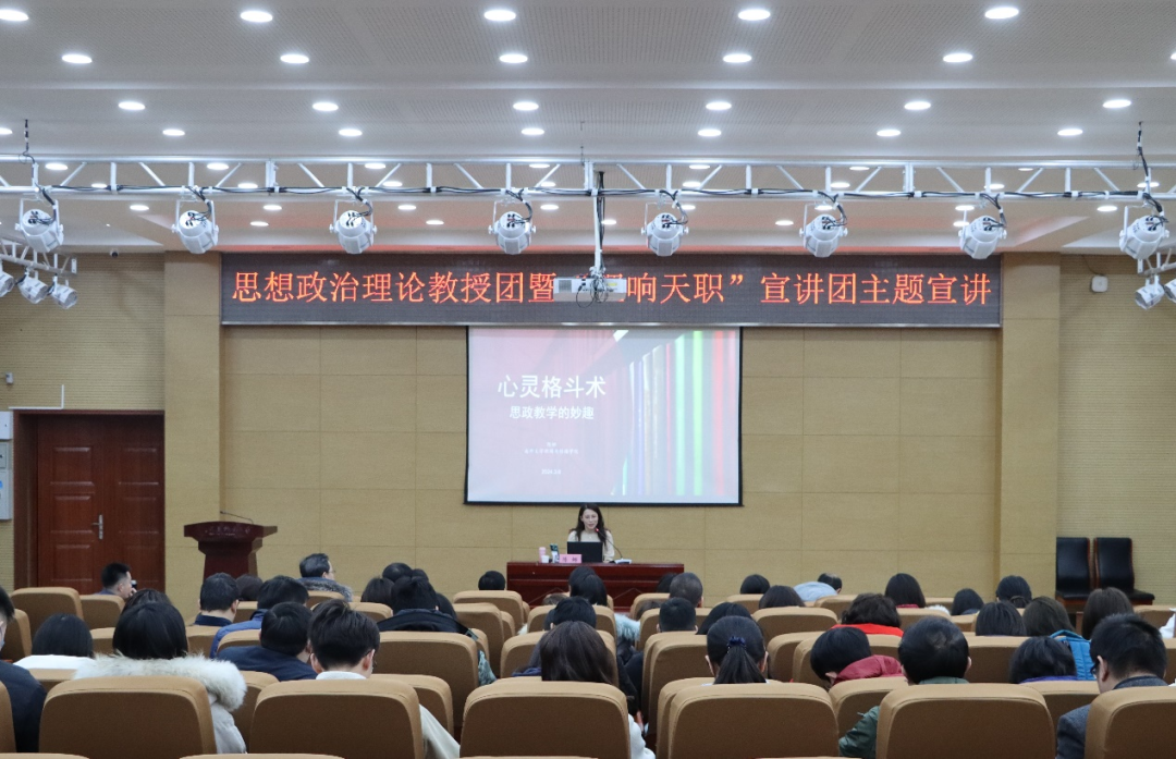 为深入贯彻落实习近平总书记视察天津重要讲话精神,持续学习贯彻习近平总书记在学校思想政治理论课教师座谈会上的重要讲话精神,聚焦立德树人根本任务,全面提升best365思政课教师教育教学能力和水平,3月6日,马克思主义学院思想政治理论教授团暨“理响天职”宣讲团特邀南开大学新闻与传播学院教授、首届全国高校青年教师教学竞赛文科组一等奖第一名获得者陈娜老师莅临best365以“心灵格斗术·思政课教学的妙趣”为题进行宣讲。本次讲座由马克思主义学院院长杨理连教授主持,best365全体思政课教师及各学院辅导员教师聆听了讲座。