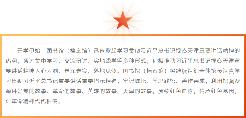 为学习宣传贯彻习近平总书记视察天津重要讲话精神,进一步巩固拓展主题教育成果,深入挖掘红色文化资源的历史内涵和教育意义,按照学校《关于开展“牢记嘱托 勇担使命”习近平总书记视察天津重要讲话精神基层宣讲活动的通知》要求,落实《图书馆(档案馆)党总支理论学习中心组学习贯彻习近平总书记视察天津重要讲话精神工作安排》,3月27日,图书馆(档案馆)党总支组织党员、馆员、学生社团“悦读社”成员共40余名师生走进平津战役纪念馆参观学习。