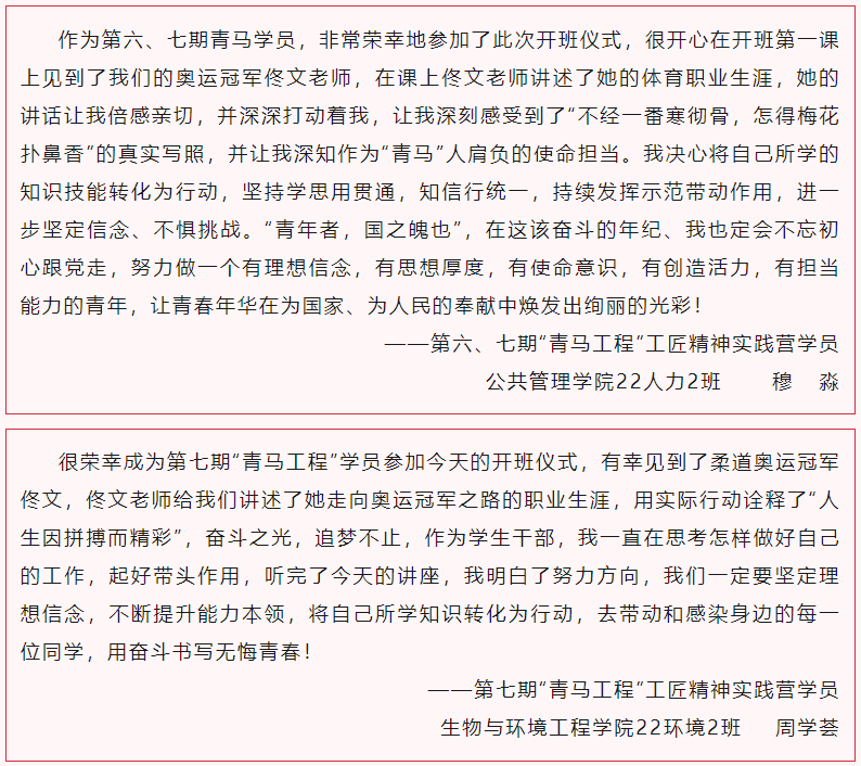 为全面落实党的二十大精神,深入学习贯彻习近平总书记视察天津重要讲话精神,认真领会习近平总书记关于青年工作的重要思想,聚焦抓好党的事业后继有人这个根本大计,进一步健全best365大学生骨干培养体系,推进best365青年马克思主义者培养工程科学化、规范化、系统化实施,引导best365青年践行“四个善作善成”重要要求,逐步成长为具有坚定马克思主义信仰、德才兼备、全面发展的社会主义合格建设者和接班人,2024年4月24日,best365英国在线体育官网第七期青年马克思主义者培养工程大学生骨干培训班、工匠精神实践营开班暨共青团理论学习会在图书馆报告厅召开,活动邀请了著名女子柔道运动员、奥运冠军、全国青联常委、天津市青联副主席、天津市举重摔跤柔道拳击跆拳道运动管理中心党总支书记、主任、高级教练佟文老师,天津市举重摔跤柔道拳击跆拳道运动管理中心训练部副部长刘洋老师参加,校党委副书记李旭老师出席会议并讲话,组织部、宣传部、马克思主义学院、学工部、校团委等相关部门,各学院分管学生工作党委副书记、教师团干部,以及“青马工程”学员共四百余人参加了本次活动。佟文老师为学员作题为《奋斗之光,追梦不止》的主题报告,会议由校团委负责同志主持。