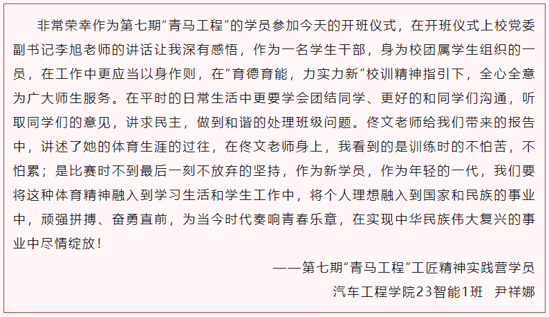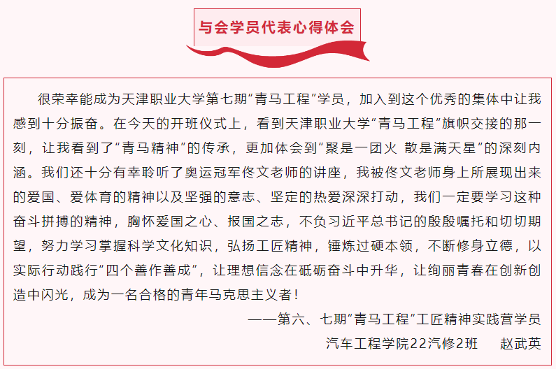 校团委负责同志回顾了第六期“青马工程”建设情况,对第七期“青马工程”实施方案进行解读,激励全体学员珍惜在校时间、刻苦学习钻研,践行工匠精神,勇于拼搏创造。会上,“青马工程”新老学员代表还分别做了典型发言,完成旗帜交接,充分展现了天职青年对党和人民的一片赤诚,以及见贤思齐笃行、不断超越自我、勇担时代重任、敢于拼搏奉献的坚定信念与执着追求。