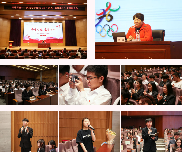 佟文老师在报告中从初识恩师走上柔道之路、梦想因坚持而圆满、年轻理应奋斗生活本该多彩等八个方面,分享了她的青春奋斗故事,特别是她在北京奥运会上“一分钟逆转夺金”的场景,让在场师生们深刻体会到了青年运动员的拼搏精神和奋斗力量,更加坚定奋斗的青春最美丽,拼搏的人生更精彩。整场报告过程中全场多次响起热烈掌声,师生深受感动、倍感激励,纷纷表示要向佟文老师学习,在奋斗中逐梦,彰显青春风采,在自己的领域各尽所能、发光发热,为实现中华民族伟大复兴的中国梦贡献力量。报告期间佟文老师与同学们亲切交流互动、解答相关疑问和困惑,会后跟大家合影签名留念,现场氛围温馨而热烈。