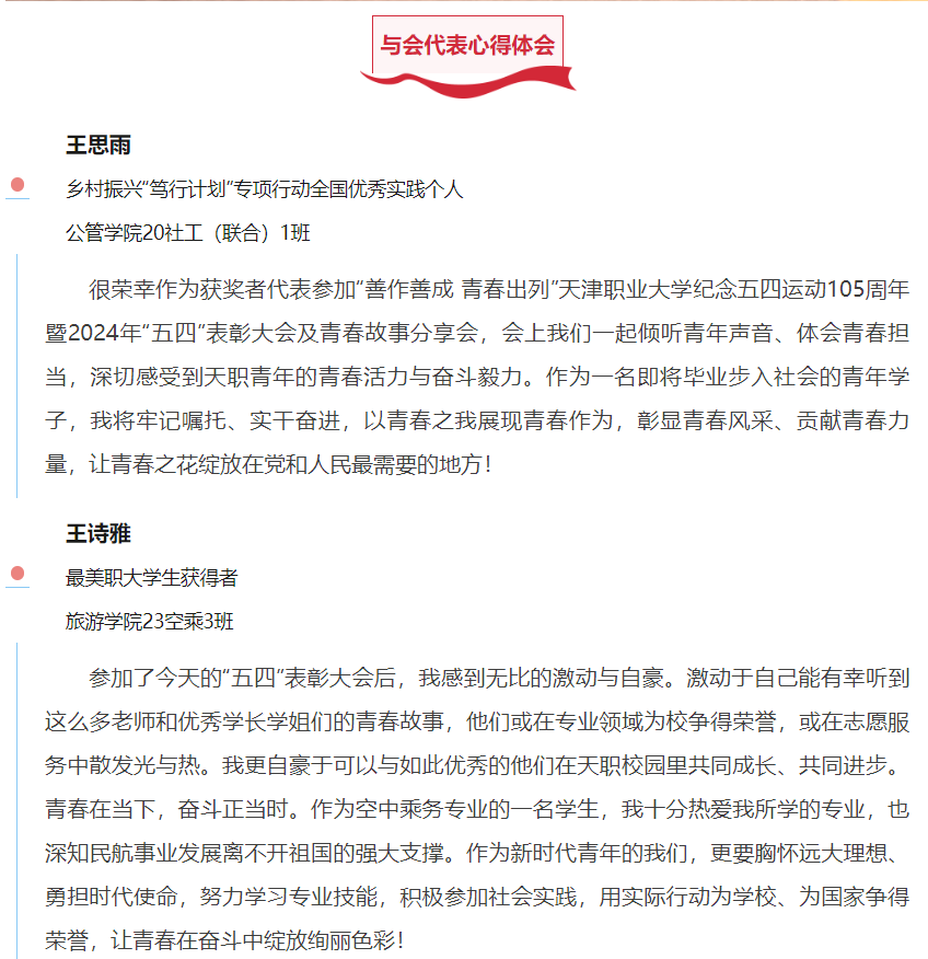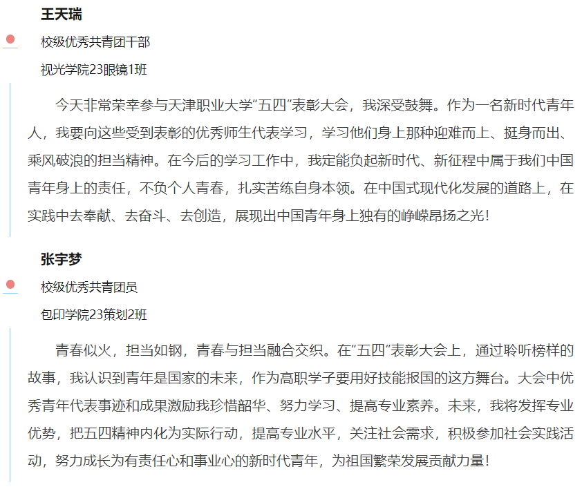 希望受到表彰的集体和个人珍惜荣誉,赓续传统,挺膺担当,勇立新功。全校各级团组织、团员和团干部要以党的二十大精神为指引,学习贯彻习近平总书记视察天津重要讲话精神,领会习近平总书记重要寄语精神,以受到表彰的先进集体和个人为榜样,继承和发扬五四精神,坚定不移听党话、跟党走,争做有理想、敢担当、能吃苦、肯奋斗的新时代好青年,在推进强国建设、民族复兴伟业中展现青春作为、彰显青春风采、贡献青春力量,奋力书写为中国式现代化挺膺担当的青春篇章。