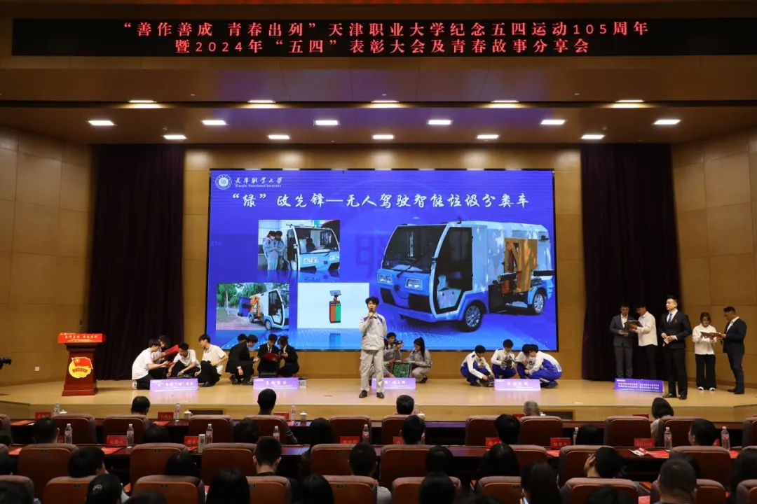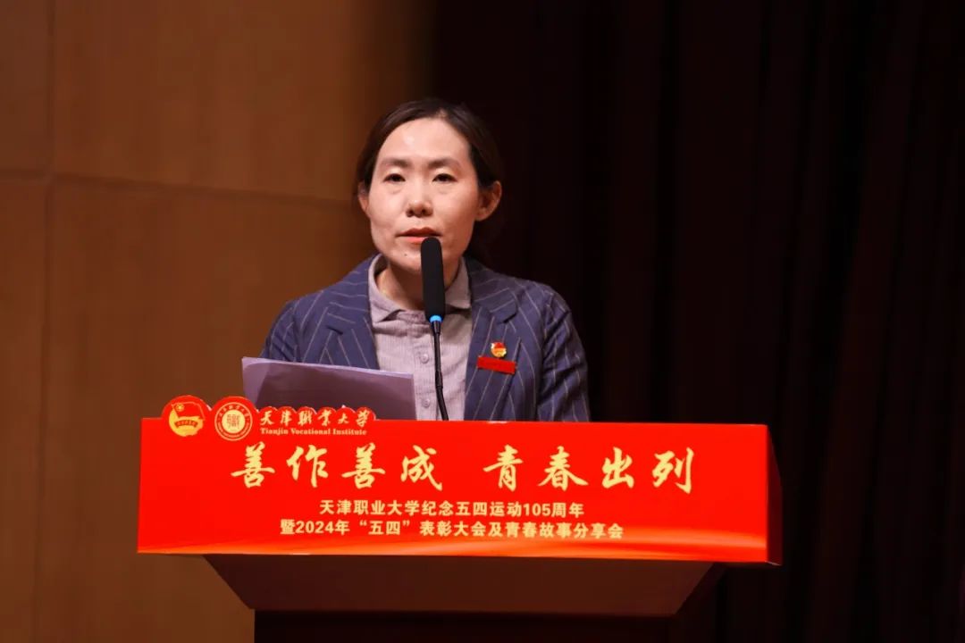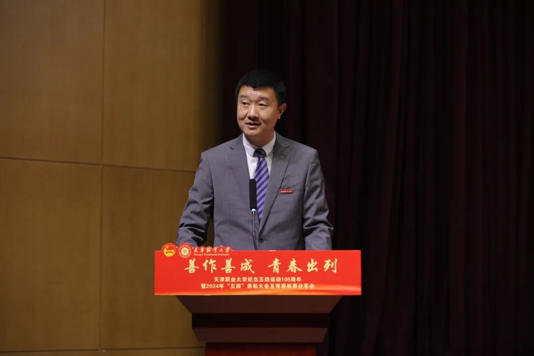 校党委副书记李旭在大会上讲话。李书记代表学校党委向受到表彰的先进集体和个人表示热烈的祝贺,对各级团组织和广大团员青年、团干部,提出了殷切的希望:要坚定理想信念,做志存高远的青年,做新时代的奋斗者,做五四精神的传承者;矢志创新创造,做与时俱进的青年,在学习和工作中创新实践,敢闯敢试、敢想敢拼;勇于砥砺奋斗,做本领过硬的青年,苦练技术技能、提升知识水平,把工匠精神融入爱国奉献的伟大实践,把个人理想融入祖国发展的伟大事业;各级团组织和团干部要引领凝聚青年学生听党话、感党恩、跟党走,进一步组织动员青年学生当先锋、建新功,不断激发青年的奋斗热情,为青年成长成才提供更多出彩机会;在五四精神的感召下,传承革命薪火,勇担强国使命,践行“四个善作善成”重要要求,把奋斗融入学校高质量发展、天津高质量发展、强国建设、民族复兴的伟大事业之中,努力成长为新时代的先锋力量。