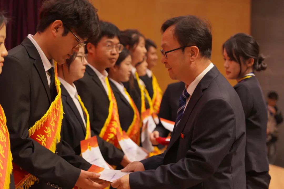 副校长冯艳文为校级优秀迎新大使、优秀志愿服务项目、优秀志愿者之星、优秀志愿者协会分会代表颁奖,为校级优秀共青团员、优秀共青团干部代表颁奖,并为全国、市级“三下乡”社会实践优秀团队、个人获奖代表颁奖