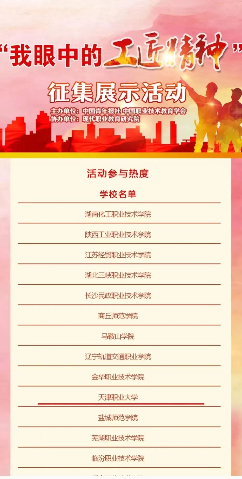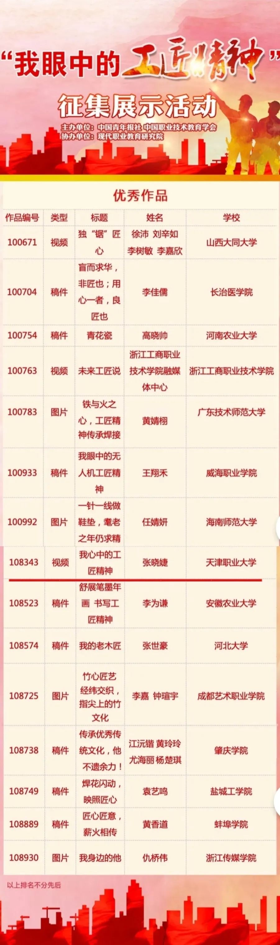 2023年11月,中国青年报社、中国职业技术教育学会主办,现代职业教育研究院等单位举办了“我眼中的工匠精神”征集展示活动,best365组织师生积极参与,总共报送作品共104份,近期承办单位已完成优秀作品征集工作。best365活动参与热度排在前20,张晓婕老师提交的视频作品《我心中的的工匠精神》入选优秀作品,评选结果已进行公示。