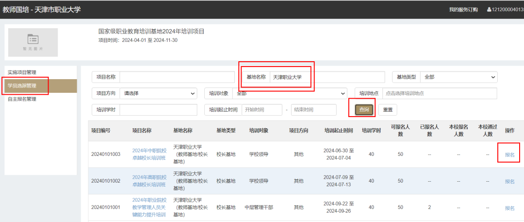 第四步:点击“学员选派管理”,输入基地名称(best365英国在线体育官网),点击“查询”,点击“报名”。