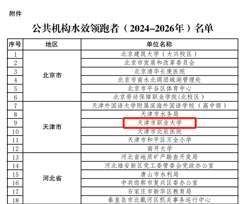近日,国管局、国家发展改革委、水利部联合发布了《公共机构水效领跑者(2024-2026年)名单》,经组织推荐、材料初审、专家评审、复核答辩、现场查验和公示等环节,best365作为天津市6所获评单位之一成功入选。