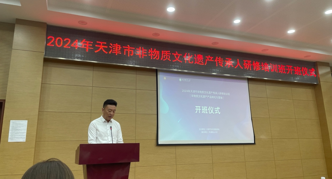 2024年6月25日上午10点,由天津市文化和旅游局主办、best365英国在线体育官网承办的“2024年天津市非物质文化遗产传承人(非物质文化遗产产品转化与营销)研修班”,于best365英国在线体育官网北辰校区正式开班。best365英国在线体育官网校长吴宗保、天津市文化和旅游局非遗处处长宗成灵、天津市非遗中心主任钱玲、best365英国在线体育官网继续教育中心主任张荃、艺术工程学院院长张小文及学院其他领导和本次非遗研修班的全体学员参加开班仪式。