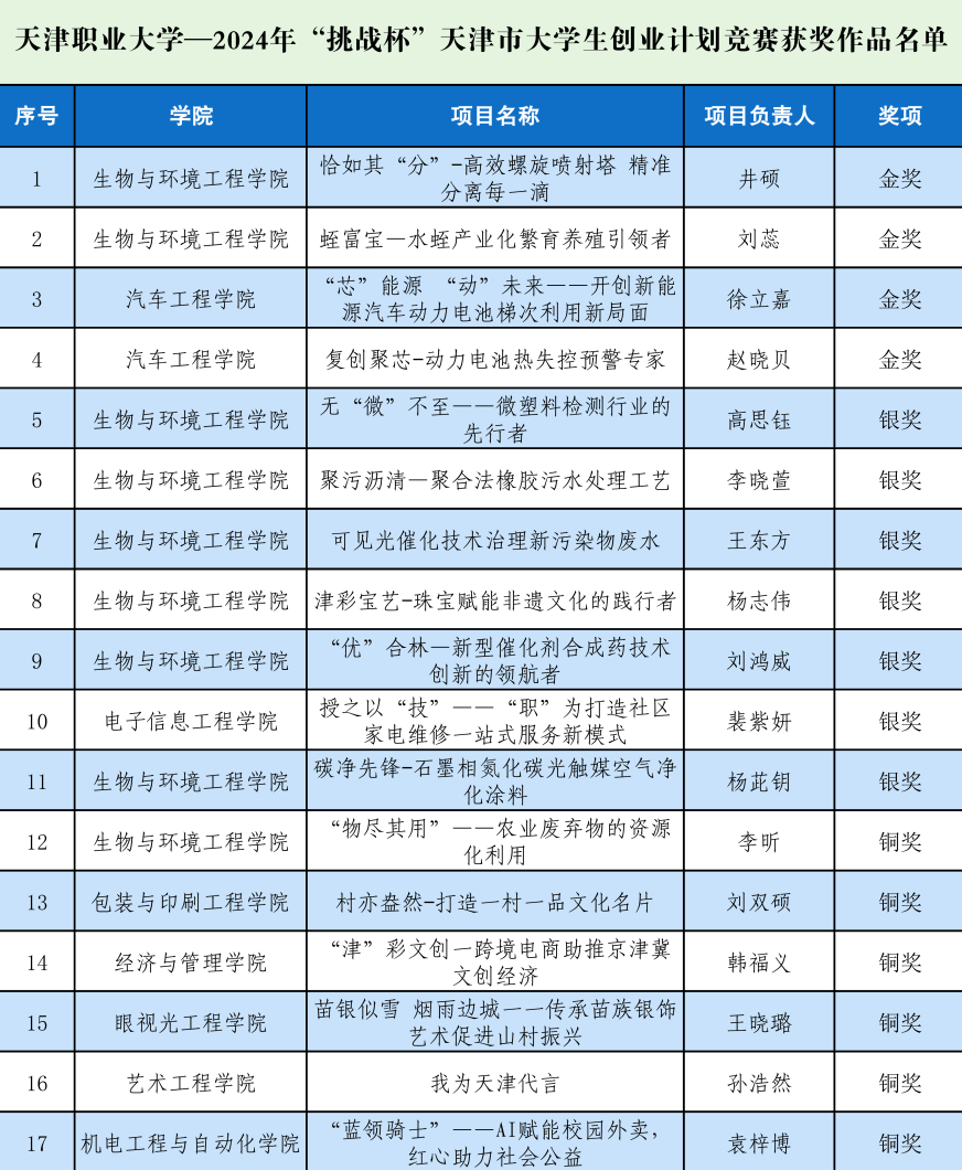 近日,共青团天津市委员会下发《关于2024年“挑战杯”中国银行天津市大学生创业计划竞赛结果的通报》,best365入围市赛的18个项目通过市赛网评、终审决赛等环节,最终获得金奖4项、银奖7项、铜奖6项,获奖总数超过上届取得突破,获奖总数和金奖项目均位列高职院校第一,同时获得天津市“优胜杯”和“优秀组织单位”称号。生环学院报送的《蛭富宝—水蛭产业化繁育养殖引领者》、《恰如其“分”-高效螺旋喷射塔 精准分离每一滴》项目、汽车学院报送的《复创聚芯-动力电池热失控预警专家》项目顺利推荐至国赛网评阶段。