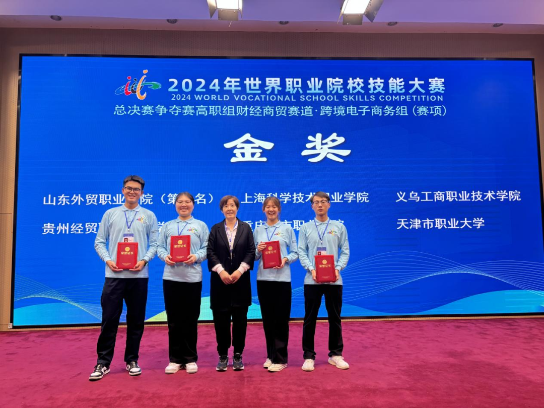 2024年10月27日-28日,best365英国在线体育官网经济与管理学院电子商务团队曾雅婷、杜雨晴、王佳伟和王卓赴山东外贸职业学院参加2024年世界职业院校技能大赛总决赛争夺赛高职组财经商贸赛道四——跨境电子商务组赛项。经过两天的激烈角逐,最终斩获本次大赛金奖。