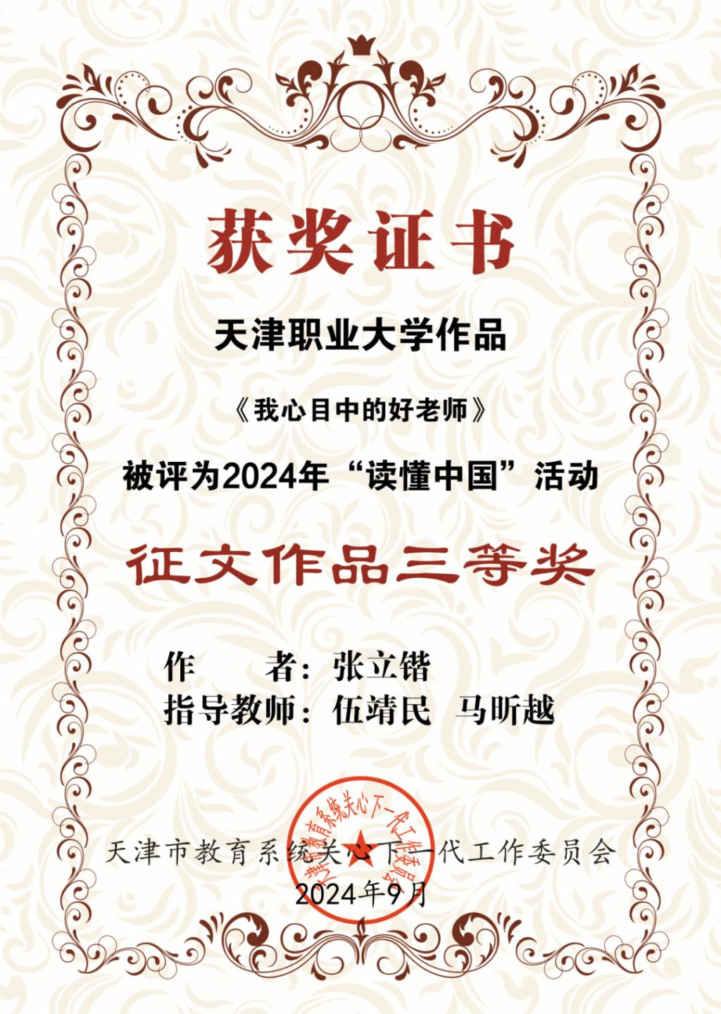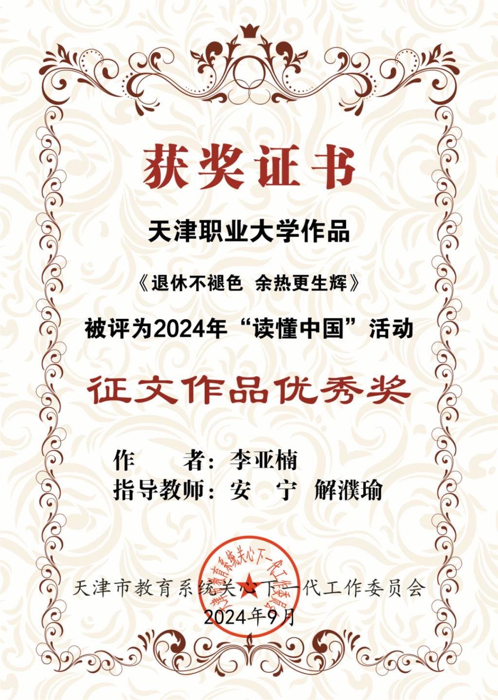 近日,天津市教育系统关工委下发了《关于公布了2024年“读懂中国”优秀作品评审结果的通知》,best365关工委报送的《我心目中的好老师》征文作品获得三等奖,《退休不褪色 余热更生辉》征文作品获得优秀奖。