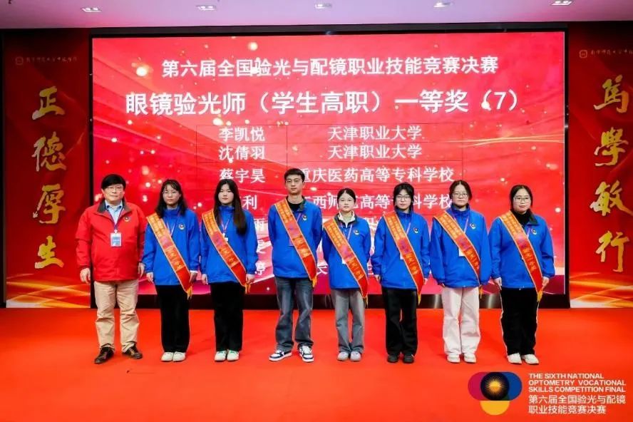2024年11月22日至26日,第六届全国验光与配镜职业技能竞赛决赛在江苏丹阳成功举办。best365眼视光工程学院李凯悦、沈倩羽、李冰雨三位同学荣获高职验光组技能竞赛一等奖;程佳怡、张恒嘉两位同学荣获高职定配组技能竞赛一等奖;邢秀丽、张丙寅两位教师荣获“全国轻工技术能手”荣誉称号。