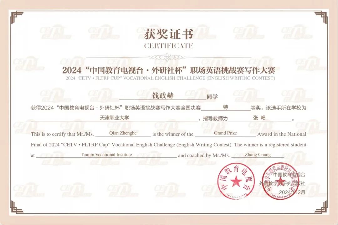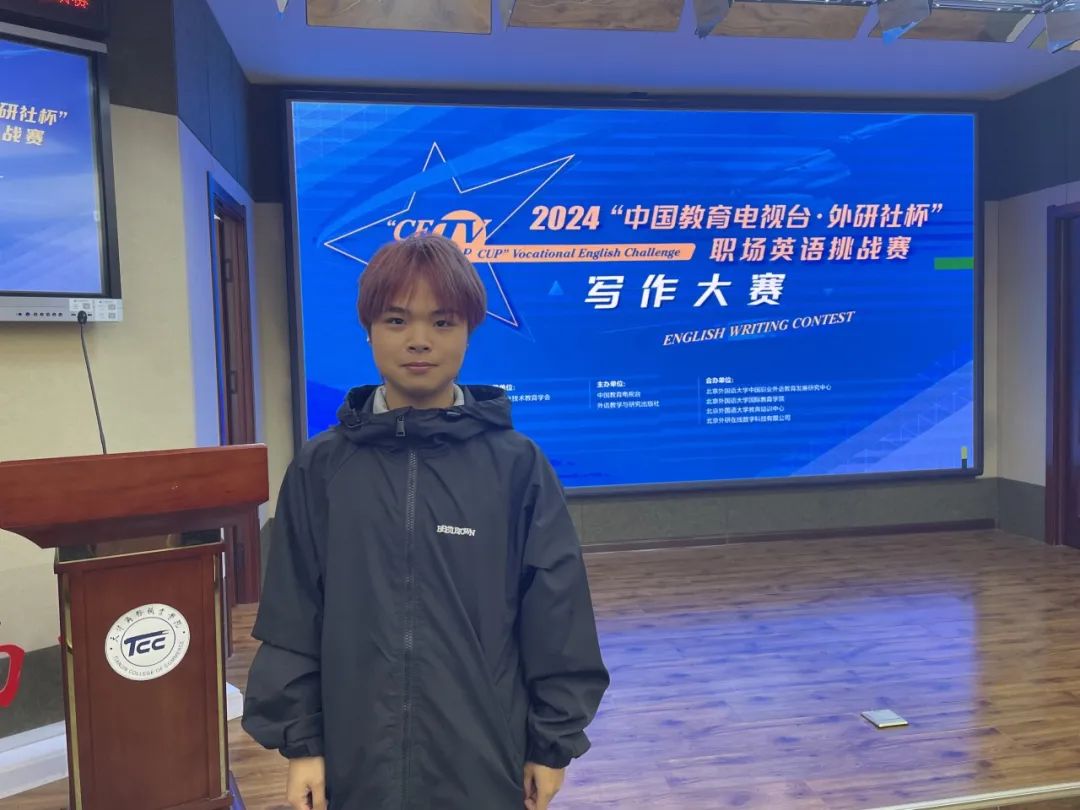 12月8日,2024“中国教育电视台·外研社杯”职场英语挑战赛写作大赛全国决赛云端成功举办。来自全国28个省、自治区、直辖市的90名优秀职教学子,以笔为锋,尽展文思,最终决出全国特等奖10名,全国一等奖15名,全国二等奖25名,全国三等奖39名。best36523级广告3班钱政赫同学表现优异,荣获写作大赛全国特等奖、天津市特等奖,创造近年最好成绩。
