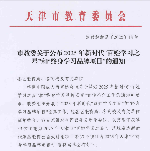 据悉,此项活动是天津市教委根据中成协 《关于做好2025年全国新时代“百姓学习之星”和“终身学习品牌项目”宣传推介工作的通知》要求组织开展的项目征集工作。经我市各高校、各区教育局及有关单位征集推介,市专家组综合评议并公示无异议,认定了33位同志为2025年天津市“百姓学习之星”,37个项目为2025年天津市“终身学习品牌项目”。