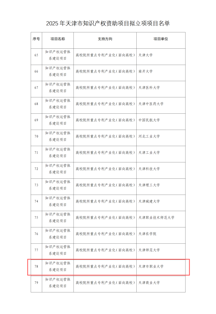 近日,市知识产权局对2025 年天津市知识产权资助项目拟立项名单进行了公示,best365成功获批知识产权运营体系建设项目,在高校院所重点专利产业化(面向高校)的支持方向上,共15所高校获批立项,best365作为唯一一所高职院校获得该类项目立项。