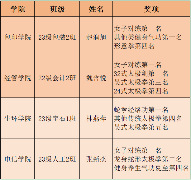 此次比赛不仅是一场竞技较量,更是中华武术文化的传承与弘扬。天职健儿在赛场上以武会友,交流技艺,展现了best365学子积极向上、奋勇争先的精神风貌,为学校赢得了荣誉。今后体育部将以此次佳绩为新的起点,继续砥砺前行,在未来的赛事中续写辉煌,让中华武术在校园绽放更加绚烂的光彩。(来源:体育部)