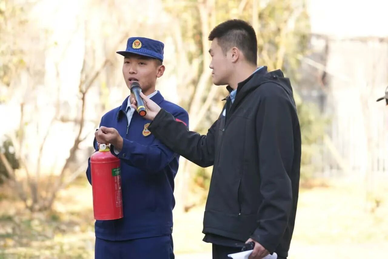 演练过程中,同学们听到警报后迅速反应,有序向安全区域撤离。辅导员老师迅速进入公寓楼引导学生,待学生撤离至指定区域后,及时集合点名。演习现场模拟了营救被困人员、扑灭易燃物火情、抢救伤员等场景,邀请消防救援部门人员向师生介绍消防车上各类器材的名称、使用方法及在灭火救援中的作用,安全部老师现场组织了灭火器实操演练。
