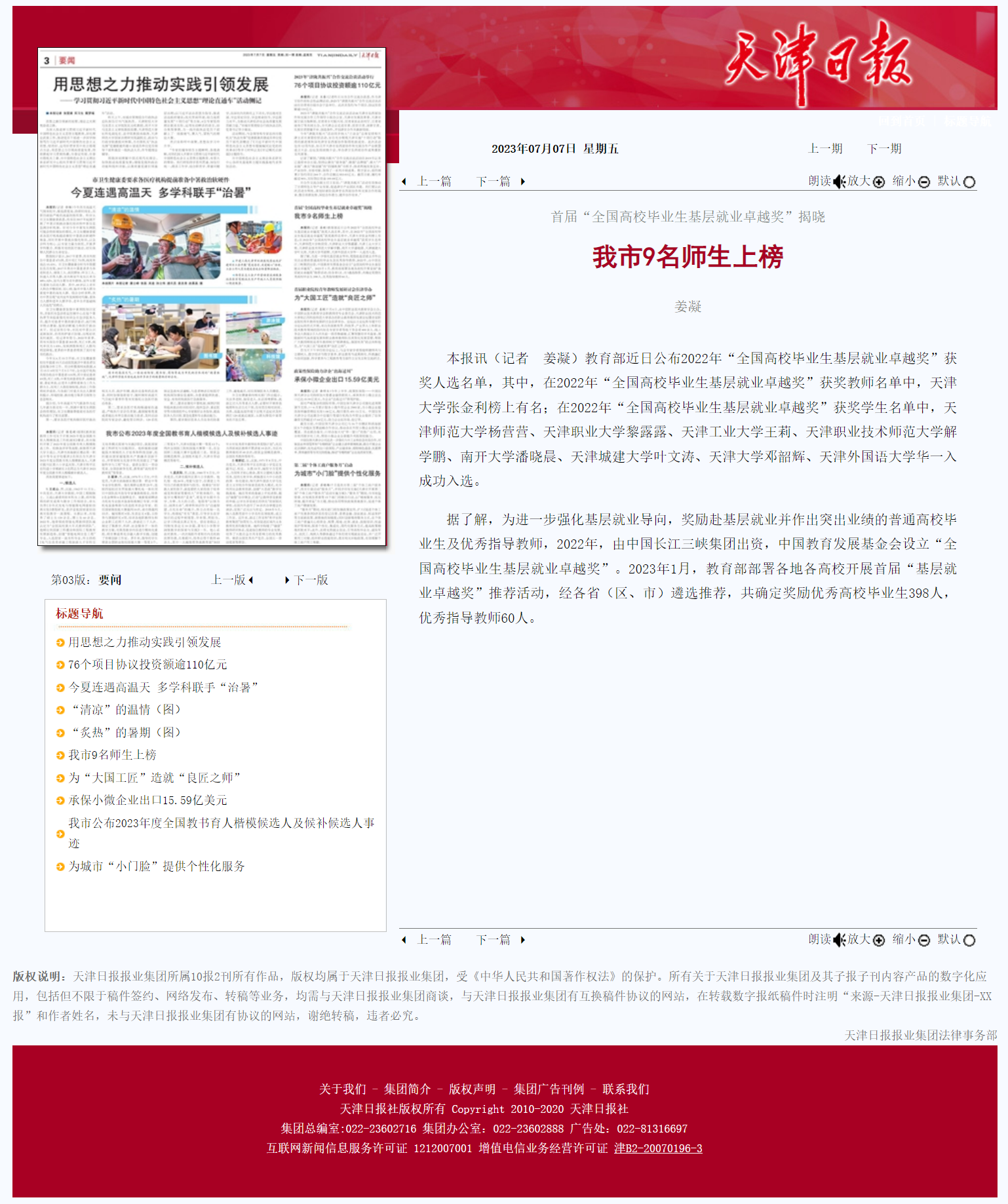 本报讯(记者 姜凝)教育部近日公布2022年“全国高校毕业生基层就业卓越奖”获奖人选名单,其中,在2022年“全国高校毕业生基层就业卓越奖”获奖教师名单中,天津大学张金利榜上有名;在2022年“全国高校毕业生基层就业卓越奖”获奖学生名单中,天津师范大学杨营营、best365英国在线体育官网黎露露、天津工业大学王莉、天津职业技术师范大学解学鹏、南开大学潘晓晨、天津城建大学叶文涛、天津大学邓韶辉、天津外国语大学华一入成功入选。