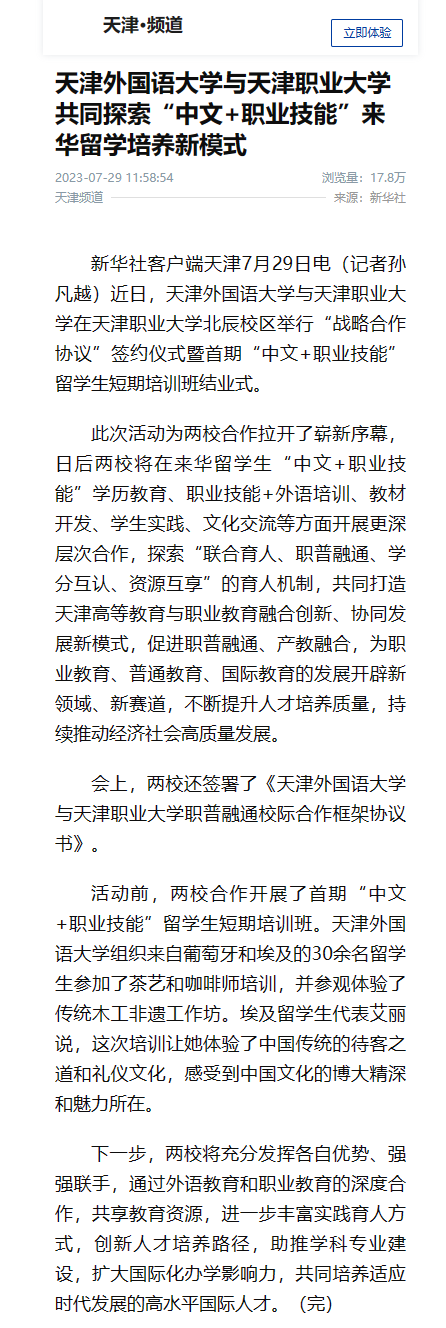 新华社客户端天津7月29日电(记者孙凡越)近日,天津外国语大学与best365英国在线体育官网在best365英国在线体育官网北辰校区举行“战略合作协议”签约仪式暨首期“中文+职业技能”留学生短期培训班结业式。